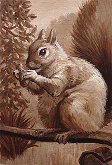 With one spastic tug, the earbuds come free from Meldwyn’s backpack and Ethel the demented squirrel leaps from the park bench. She scurries across the grass heading for the woods at the edge of the park, carrying Meldwyns iPod and dragging his headphones on the ground behind her. How could Meldwyn’s regularly scheduled afternoon outing have gone so wrong? He takes three deep breaths and calmly zips up his backpack. He removes the nest from his hair and bids the displaced bird adieu. Meldwyn calmly walks around the park bench and pauses, watching Ethel climb a tree with his headphones still dragging behind. He decides to follow. The squirrel perches on a branch near the entrance to the wood and watches Meldwyn approach. As he nears, Ethel bolts deeper into the woods with a high-pitched shriek of mocking laughter. She knows she has home field advantage and is feeling pretty cocky. Meldwyn turns over several plans in his head as he takes the path into the woods.
