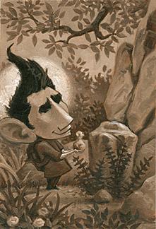 Inspired by the holy vibe, Meldwyn is trying to channel the benevolent spirits of Gandhi, Martin Luther King and yea, even Jesus himself, in an effort to reconcile the current situation. He's attempting to change the atmosphere of materialism, greed and animosity towards the ideals of peace, generosity and non violent conflict resolution. Following the examples of these great men, Meldwyn decides to make a unilateral gesture. He opens his back pack and removes the remaining peanuts. There are still a few dozen in the bag, and Meldwyn sets it on the natural stone altar. He steps back and thinks a moment. He then returns to the altar and places two pieces of sugarless gum in shiny foil wrappersthe closest thing to bling he has on himnext to the peanuts. He announces to Karfka that this is his offering of peace. He suggests that this might be considered a good place to start a negotiation for the return of his iPod. Meldwyn smiles sincerely at the squirrel, then serenely steps back several steps from the altar. He’s feeling the love and unconsciously starts humming “The Age of Aquarius”.