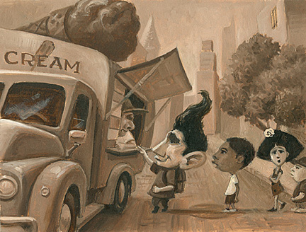 Lured by syrupy melodies emanating from crackling speakers, the irresistible call of the mother ship triggers primal pavlovian response mechanisms in us all. The siren song induces rapid heart rates and a torrent of drool throughout the neighborhood with the promise of happiness on a stick. His ears twitch and his nostrils flare slightly as Meldwyn nears his destination. Ahhh...the sweet, sticky smell of joy! Processed sugar in so many cool and refreshing forms. His mind is officially boggled as he takes his usual place at the front of the line and Kenny the driver greets him with a smile. A line of younger aficionados lucky enough to possess a buck’s worth of change scrounged from under cushions, liberated from coin collections or cajoled from parents or friends, forms behind him. The pause that refreshes awaits, but alas, the real work lies ahead.